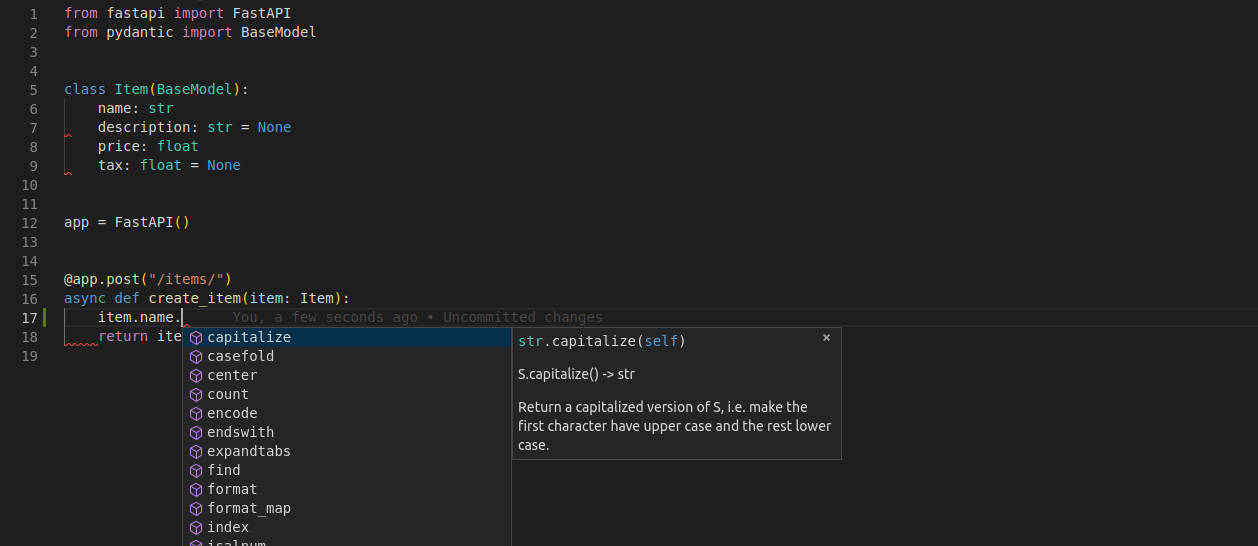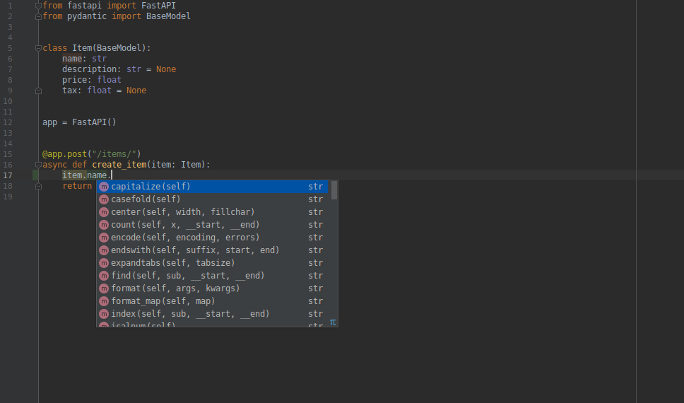 У вашому редакторі, всередині вашої функції, ви будете отримувати підказки типу та завершення скрізь (це б не сталося, якби ви отримали dict замість моделі Pydantic):